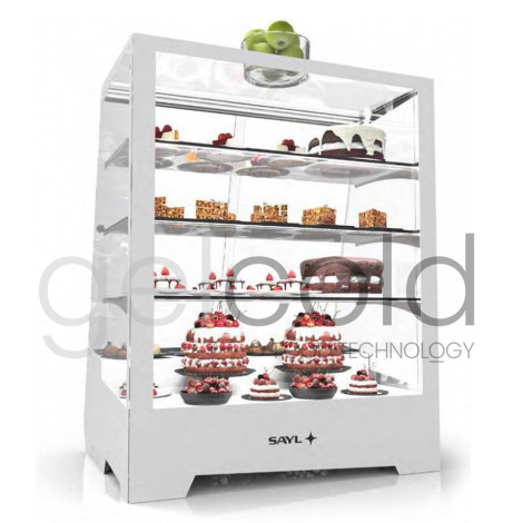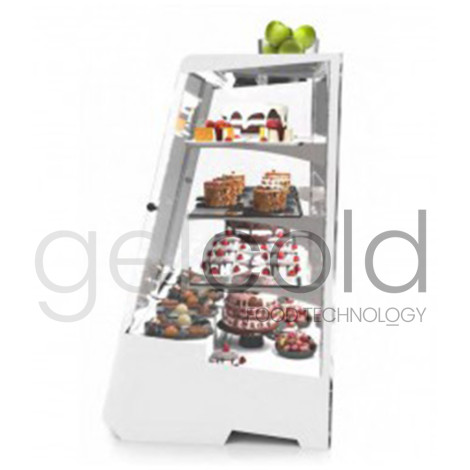 Vitrina refrigerada de sobremostrador ideal para la exposición de postres, de moderno diseño y color blanco.
